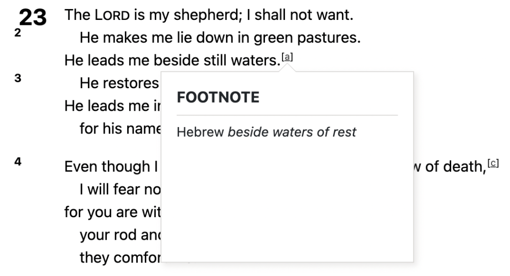 In my latest reading, though, it was a footnote from the ESV that stopped me in my tracks. Apparently, “beside waters of rest” is an alternative translation to the phrase “beside still waters.” Somehow hearing this word picture with different imagery made all the difference in my understanding and receiving it.